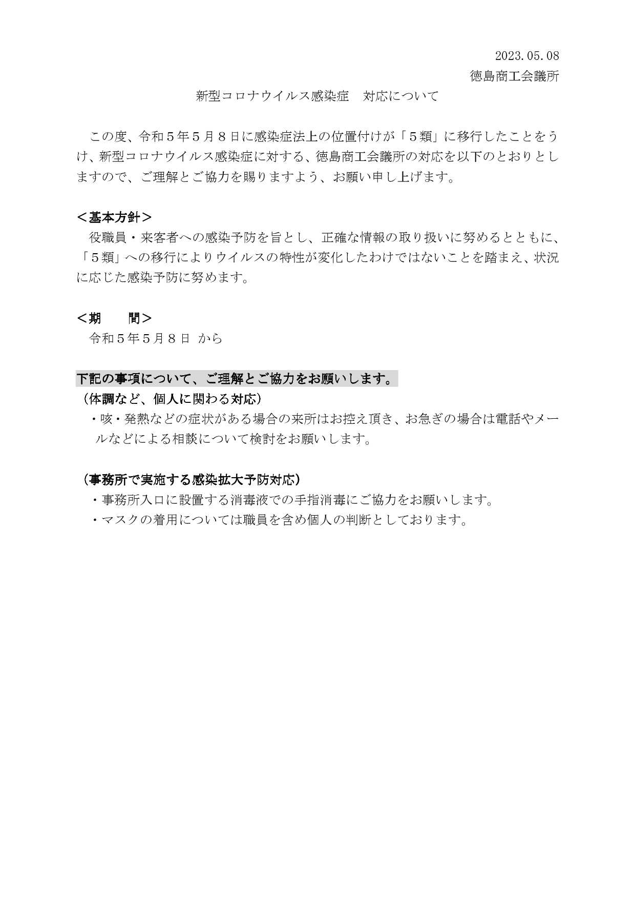【ご来訪の皆様へ】新型コロナウイルス感染症に係る当所の対応について2023年05月08日