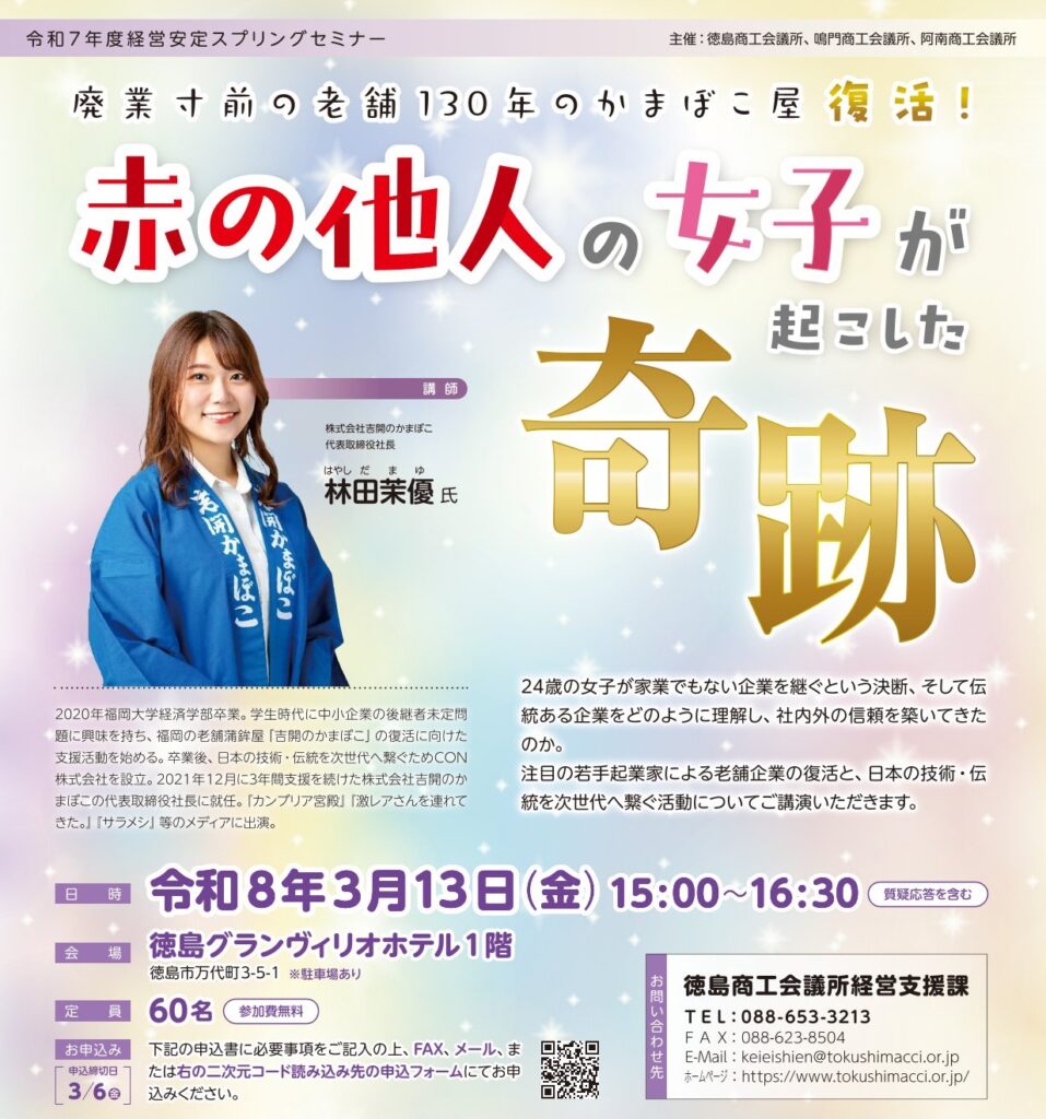 【3月13日】経営安定スプリングセミナー「廃業寸前の老舗130年のかまぼこ屋復活!赤の他人の女子が起こした奇跡」のご案内 2026年02月10日