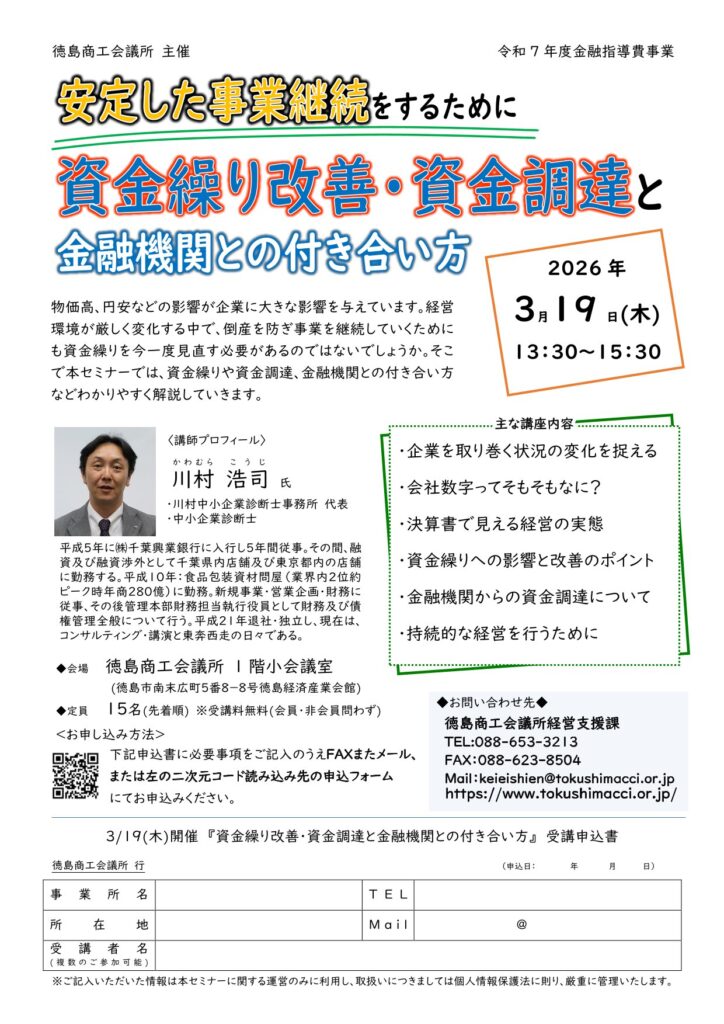 徳島商工会議所 > 新着情報 > 【3月19日】セミナー『資金繰り改善・資金調達と金融機関との付き合い方』開催のご案内