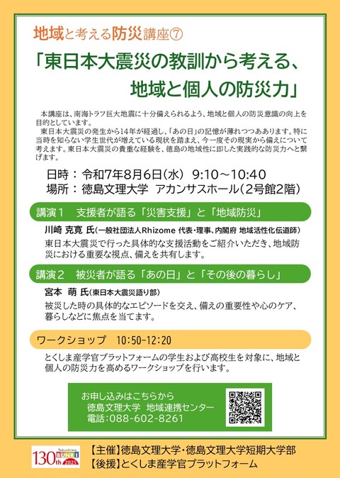 地域と考える防災講座⑦「東日本大震災の教訓から考える、地域と個人の防災力」のご案内(徳島文理大学 地域連携センター)2025年07月14日