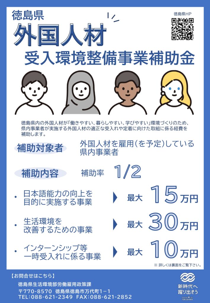 この度、徳島県 労働雇用政策課より、「徳島県外国人材受入環境整備事業補助金」について、周知依頼がありましたので、下記の通りご案内いたします。