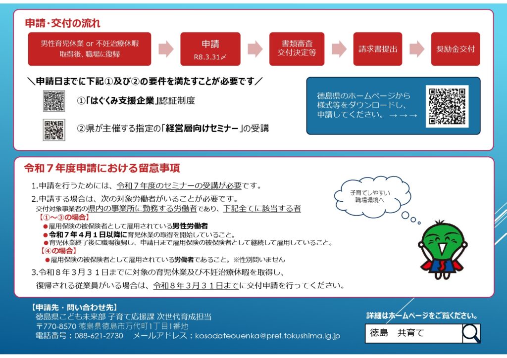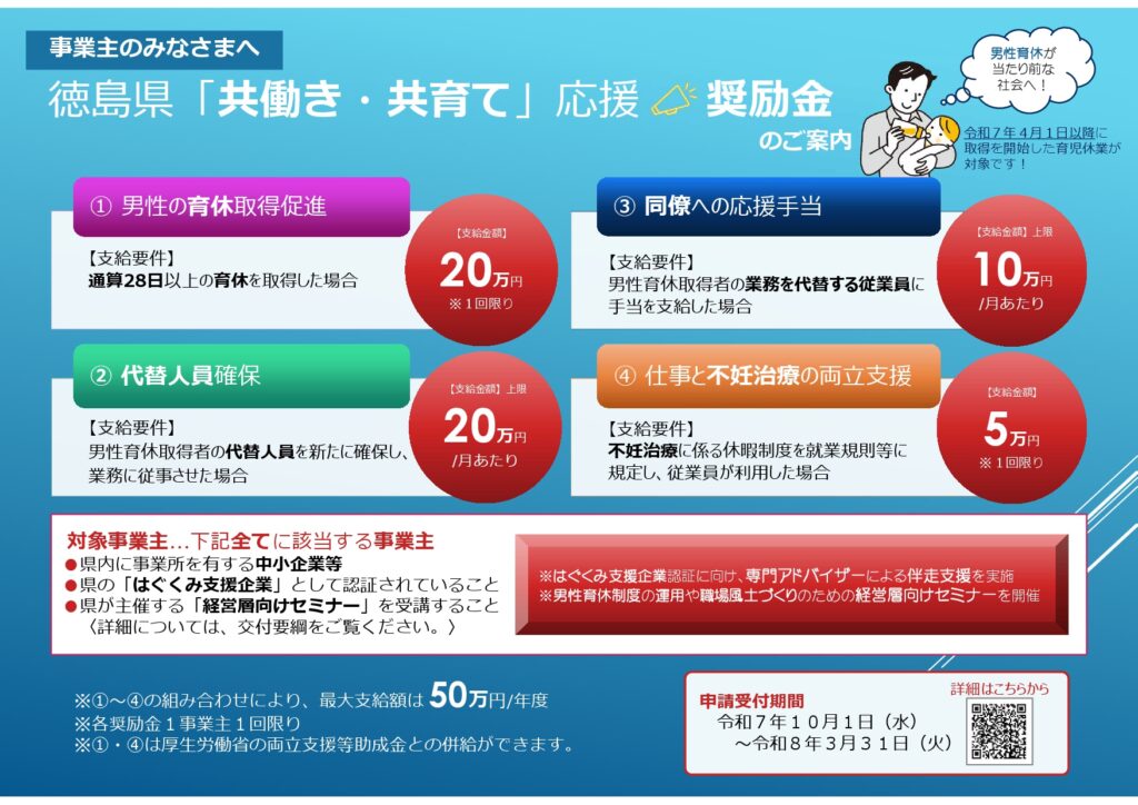 徳島県では、令和7年度より、「共働き・共育て」を推進するため、男性の育休取得促進をはじめ、男女ともに仕事と子育てが両立できる職場環境づくりに取り組む県内中小企業等への奨励金を創設しています。