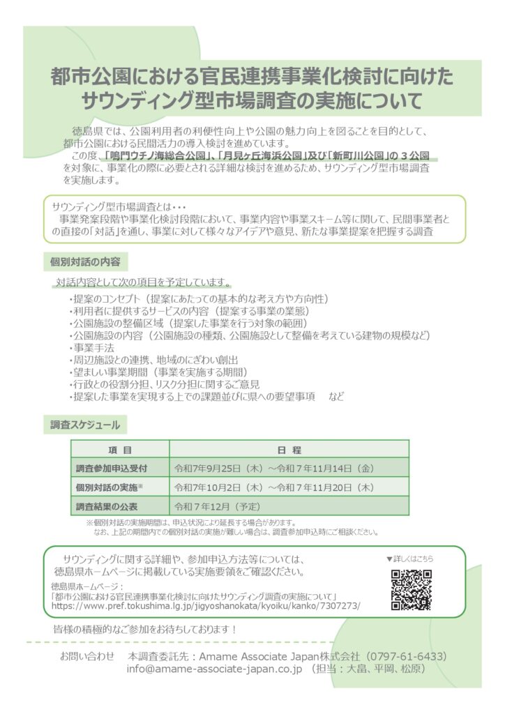 徳島県の都市公園における官民連携事業化検討に向けたサウンディング調査の実施について (観光スポーツ文化部 にぎわい政策課)2025年10月07日