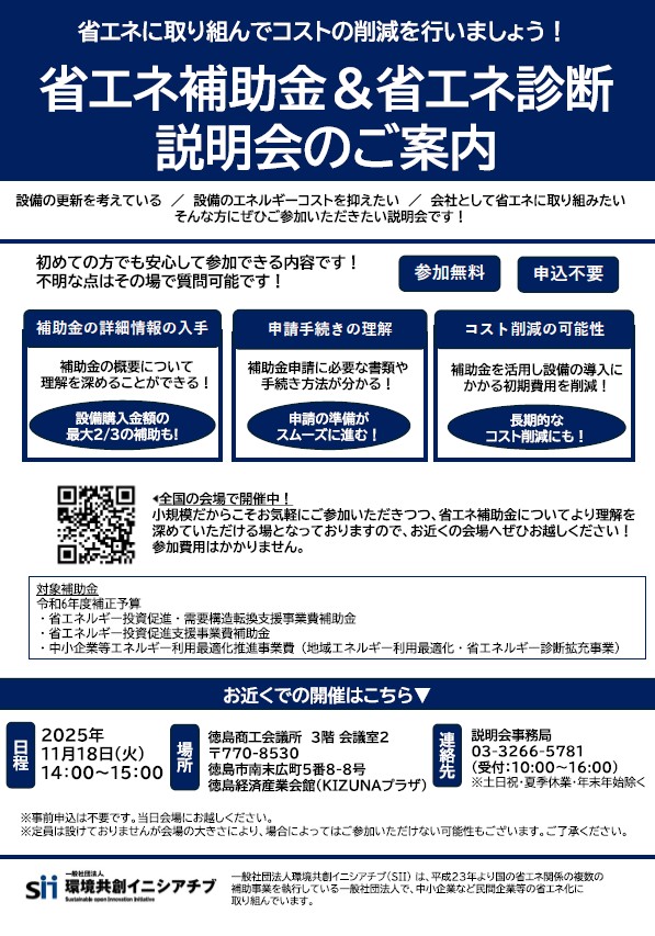 この度、一般社団法人環境共創イニシアチブが行う、省エネ補助金&省エネ診断説明会について、周知依頼がありましたので、下記の通りご案内いたします。