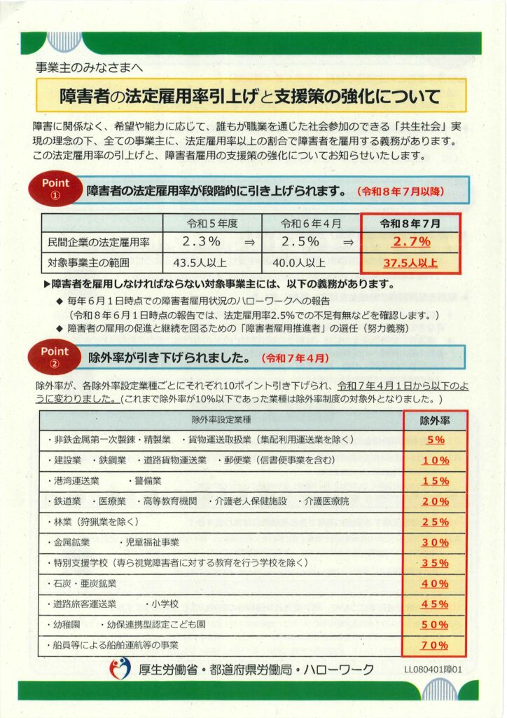 つきましては、障害者の法定雇用率引き上げと支援策の強化について、ご配慮とご協力をお願いいたします。