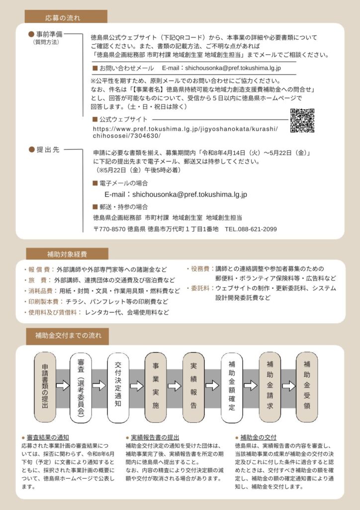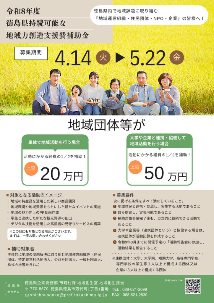 【徳島県】令和8年度「徳島県持続可能な地域力創造支援費補助金」のご案内2026年04月17日